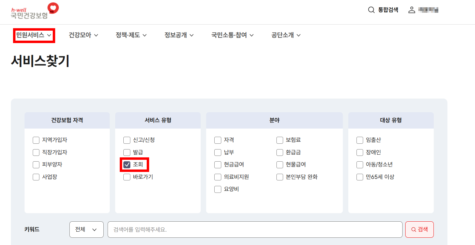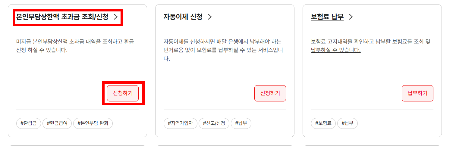 - 로그인 → [민원서비스] 메뉴 → [서비스 유형] → [조회] 클릭 → [본인부담상한액 초과금 조회/신청] 클릭