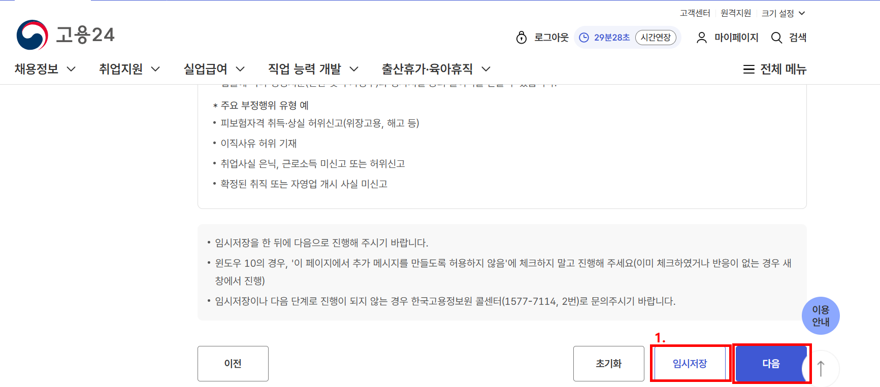 문제가 없으면 '임시저장' 을 누른 후 ‘다음’으로 넘어갑니다.”