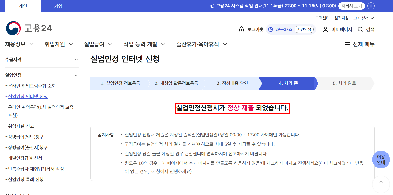 인터넷 실업인정 신청이 정상적으로 전송되었습니다. XXX센터