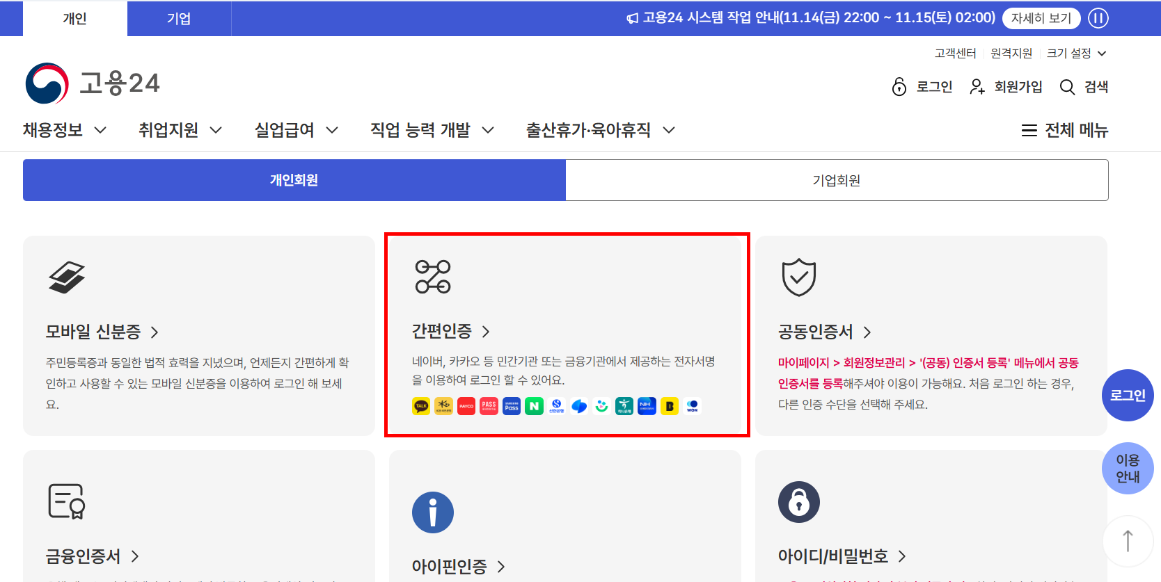 “실업인정 신청은 반드시 공동인증서 로그인이 필요합니다. ‘공동인증서 로그인’을 선택해주세요.”
