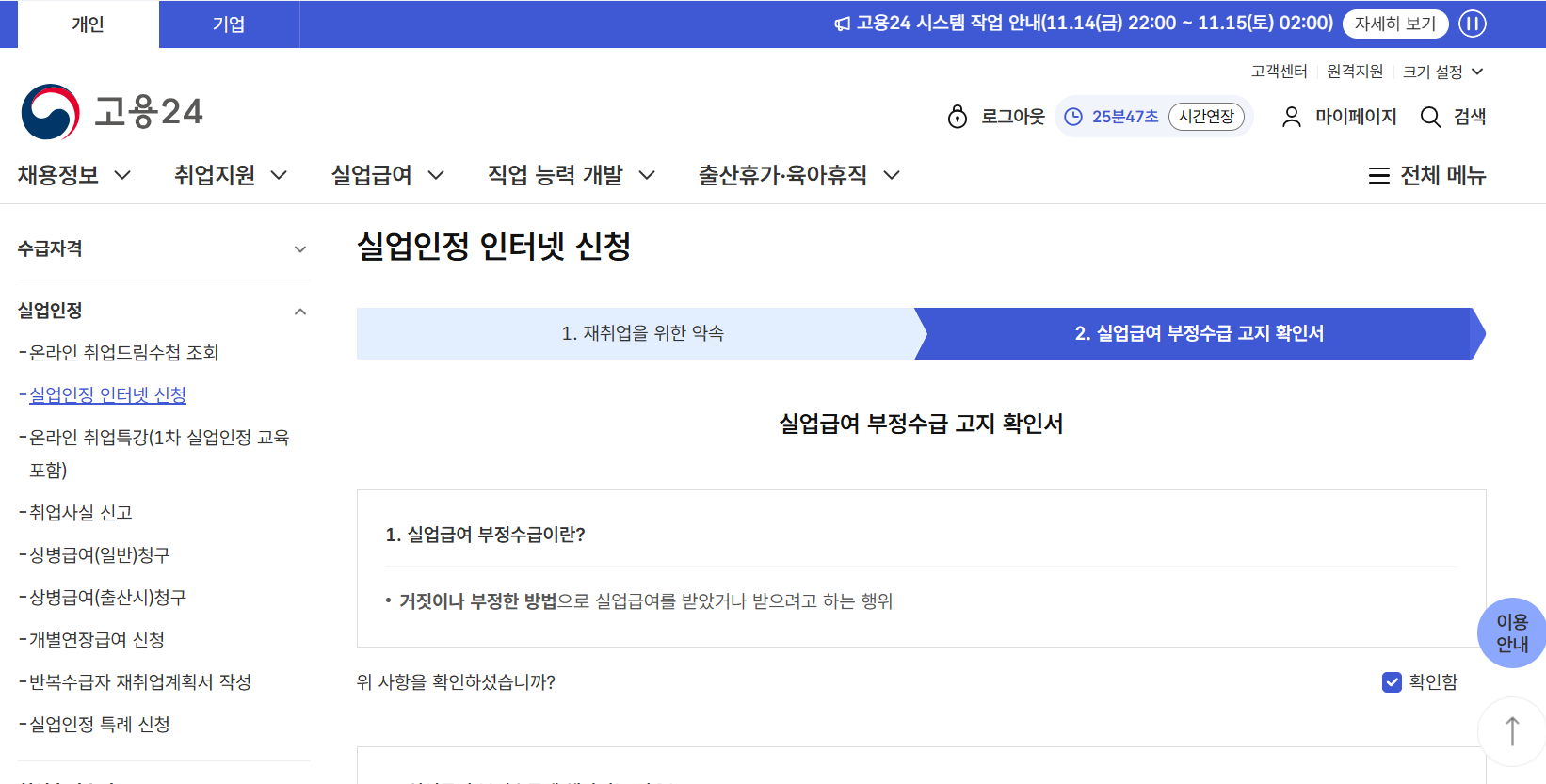 7: 실업인정 주의사항 안내 화면