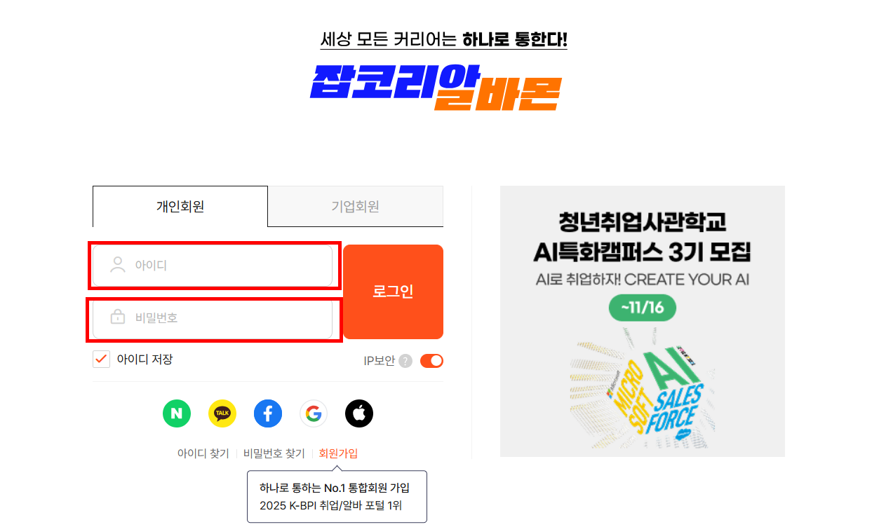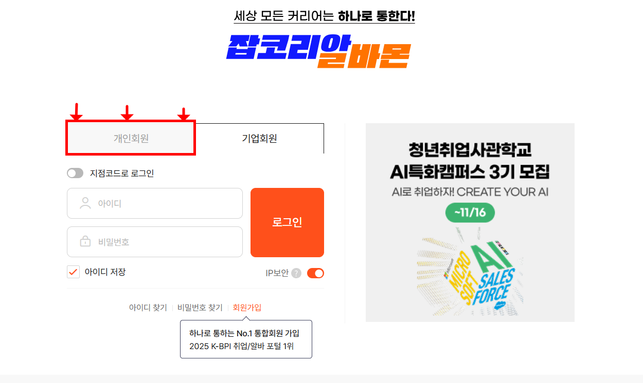 - "기업회원" 로그인 페이지가 나오지만, 바로 옆 "개인회원" 으로 로그인