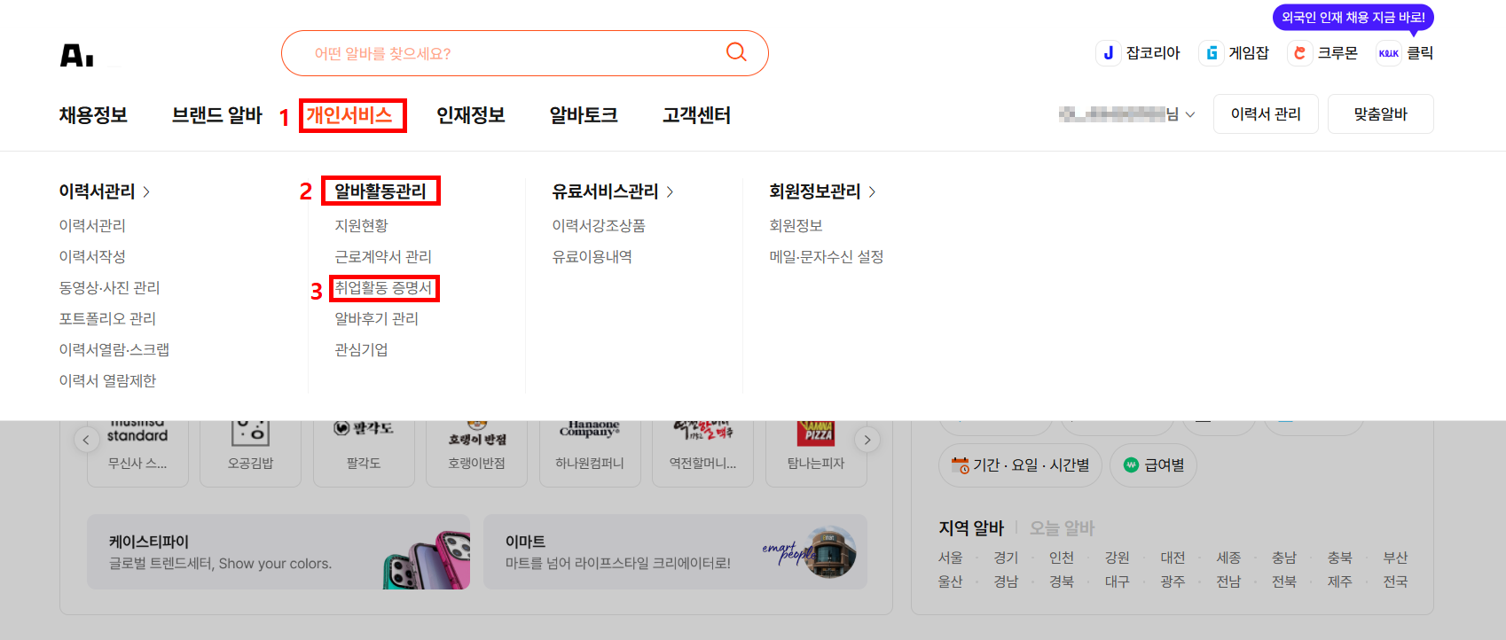 “개인서비스 → 알바활동관리 → 취업활동증명서"