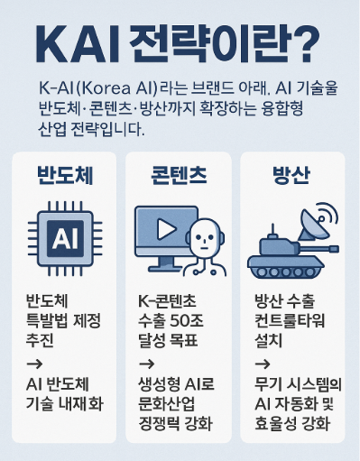 K-AI(Korea AI)라는 브랜드 아래, AI 기술을 반도체·콘텐츠·방산까지 확장하는 융합형 산업 전략입니다.