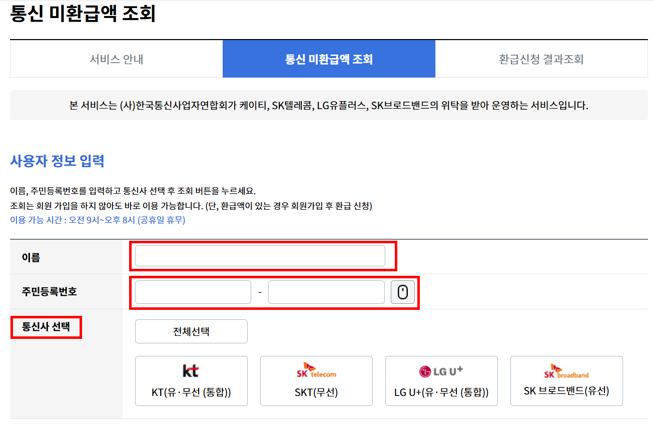SKT·KT·유플러스 고객 모두 한 번에 미환금액 조회 및 환급 신청이 가능합니다.